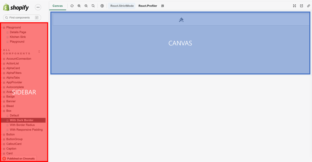 Storybook provides a sidebar and canvas to facilitate navigating stories. Sidebar consists of directories to stories, where developers can view UI components used in project.