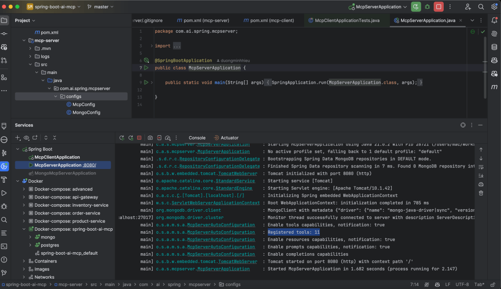 - spring-ai-starter-mcp-client: gives the core MCP client features needed to connect and communicate with an MCP server.