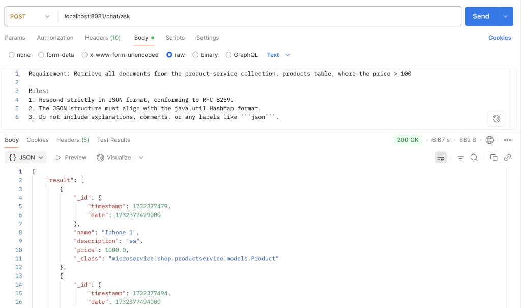 - The tool queries the necessary data source (e.g., MongoDB or PostgreSQL).