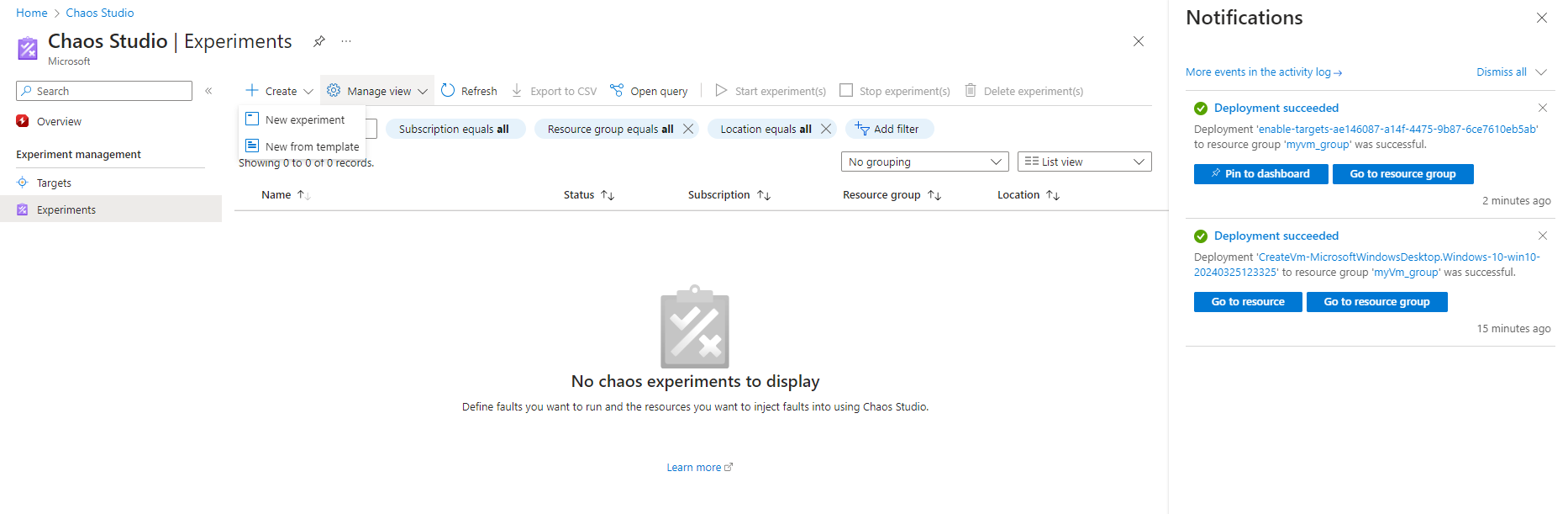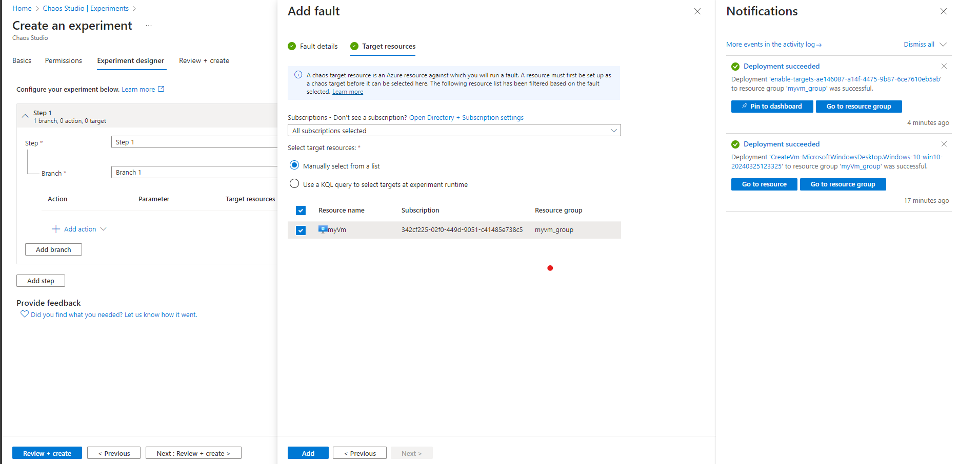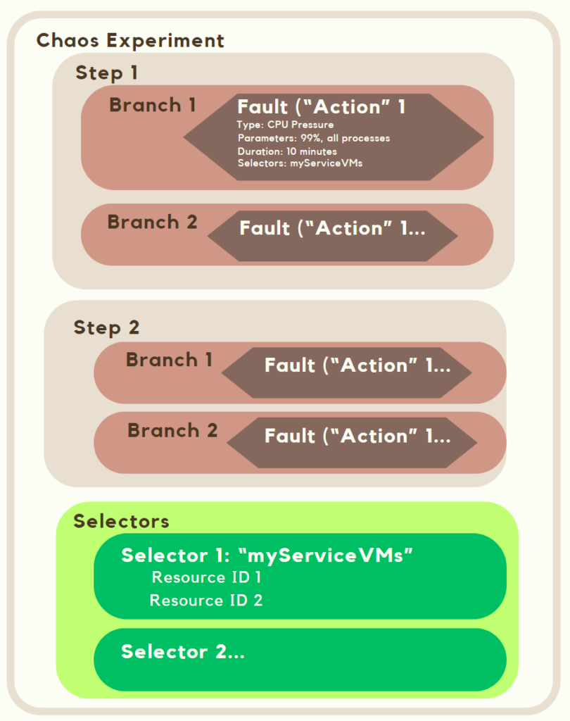 The core of Chaos Studio is its Chaos experiments. A chaos experiment describes the faults to run and the resources (target) to run against. Faults in each experiment can be organized to run in parallel or sequence, depending on our needs.
