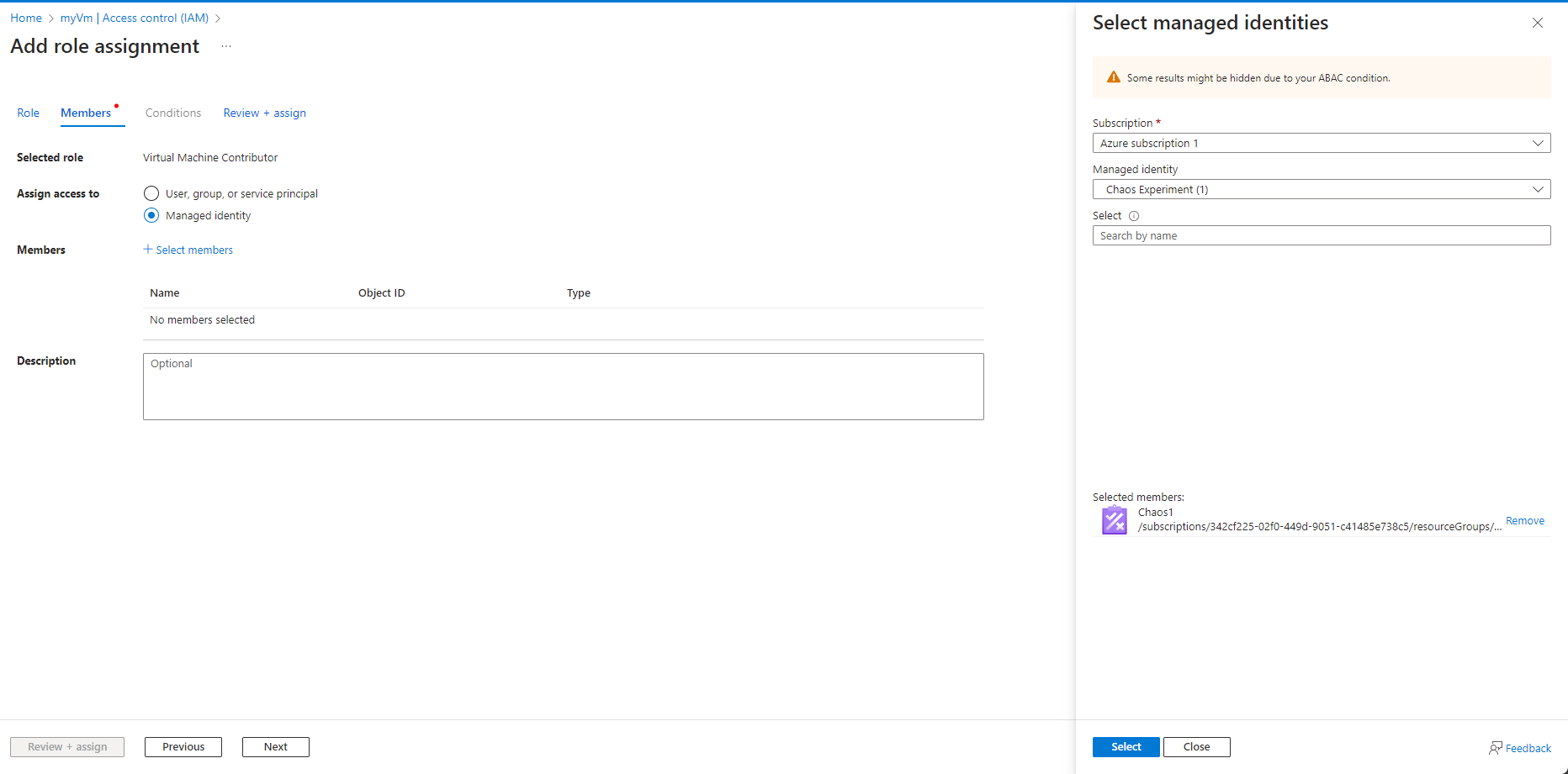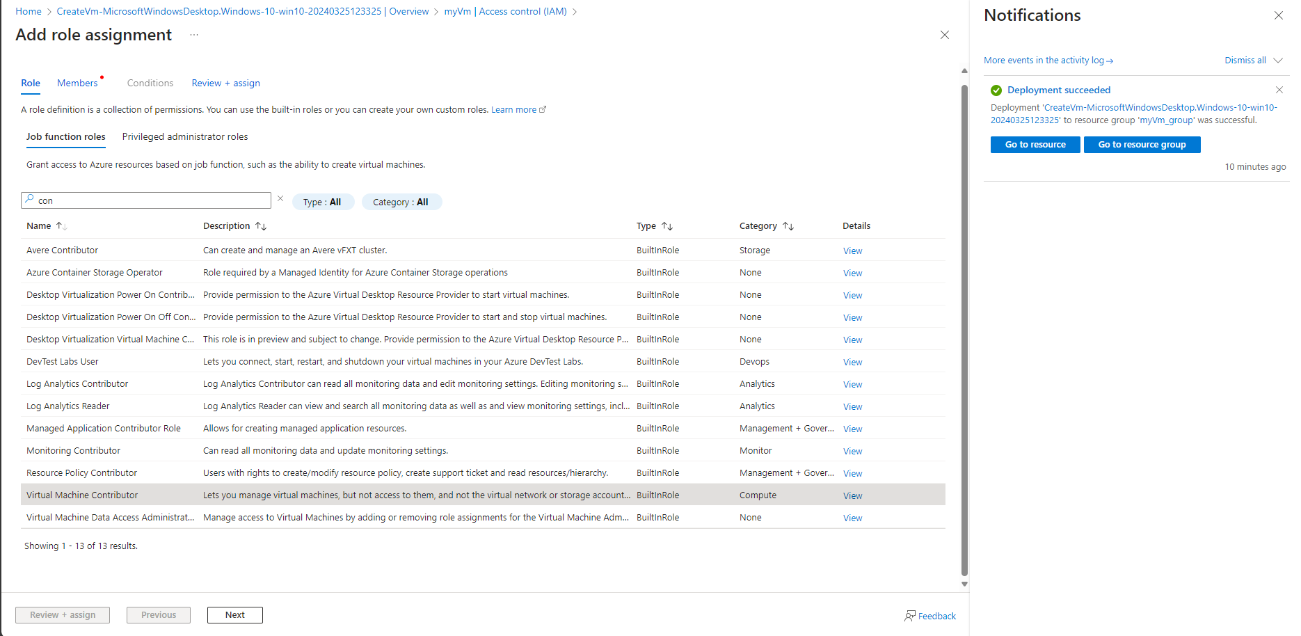 4.3 Search for Virtual Machine Contributor and select the role. Select Next.