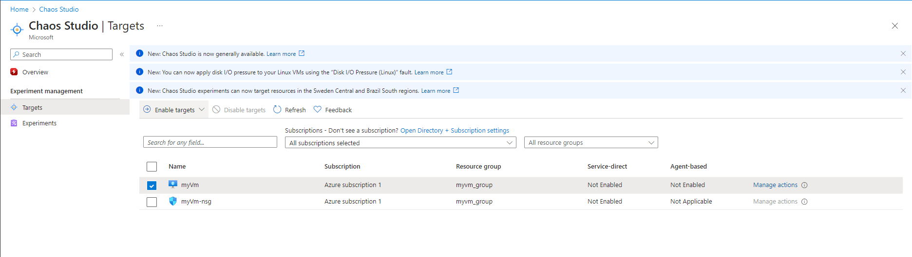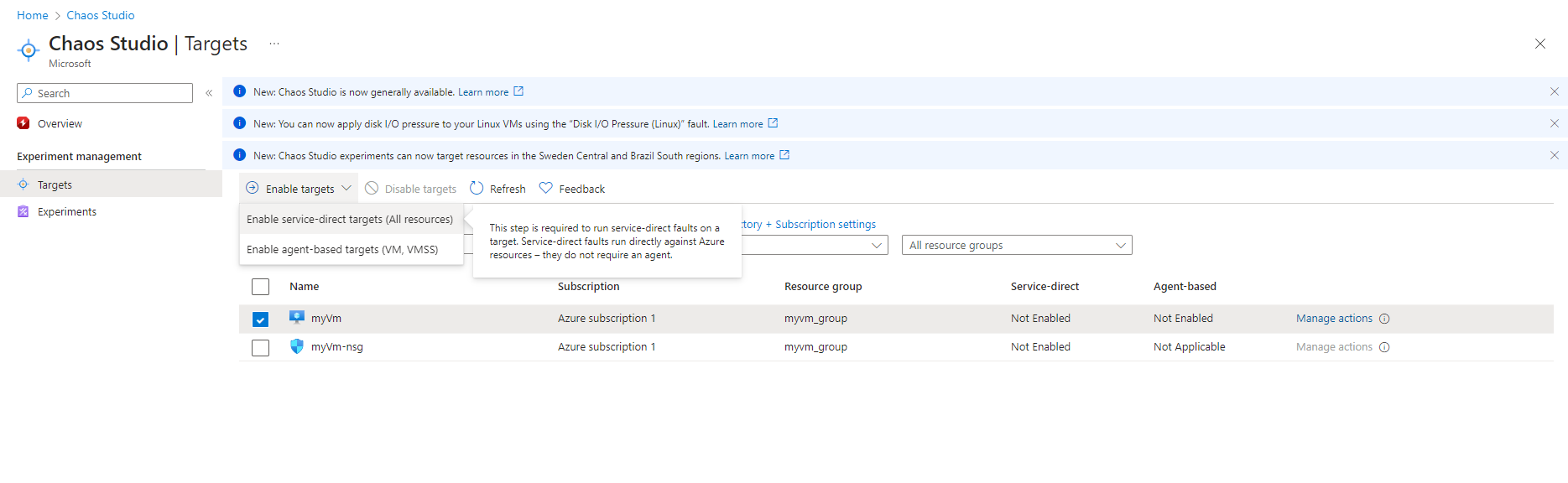 Before we can inject a fault against an Azure resource, the resource must first have corresponding targets and capabilities enabled. Targets and capabilities control which resources are enabled for fault injection and which faults can run against those resources.