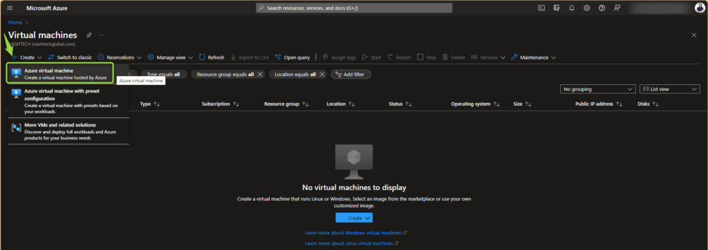 1.2 Click on Create and select Azure virtual machine