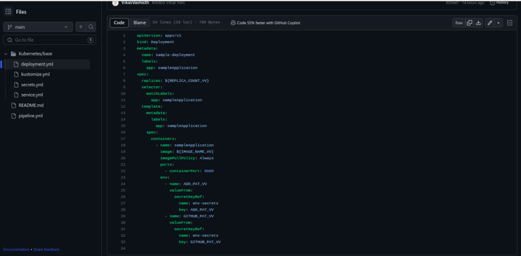 • Here, In the deployment file, we have defined the basic requirement for our application to get deployed. We have used variables for replica count and image to get their values from the pipeline at the runtime.