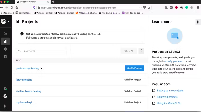 5. All projects will be displayed in CircleCI which you have pushed on Github or Bitbucket.
