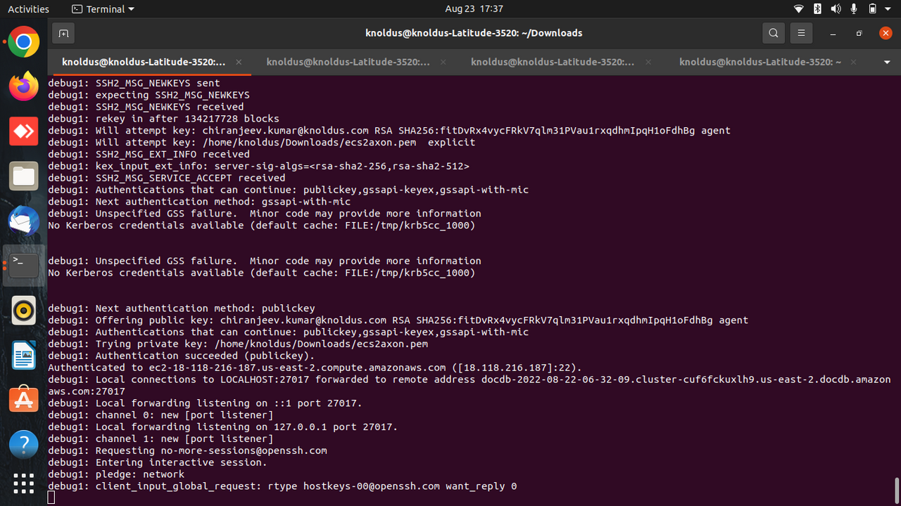 ssh -i “ec2Access.pem” -L 27017:sample-cluster.node.us-east-1.docdb.amazonaws.com:27017 ubuntu@ec2-34-229-221-164.compute-1.amazonaws.com -N