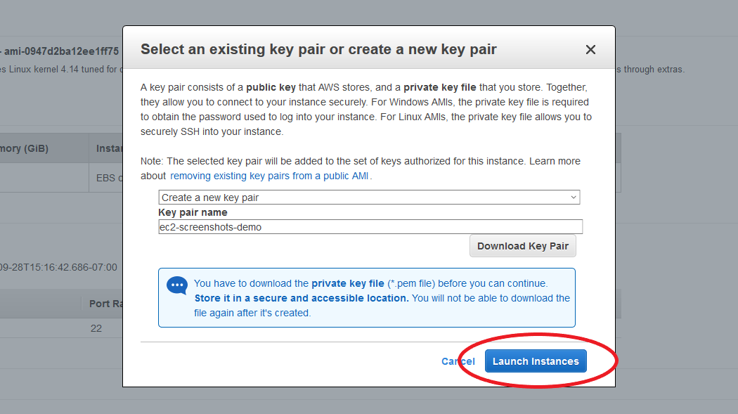 - Download the private key file (.pem file). You need this file later when you log in to your Amazon EC2 instance.