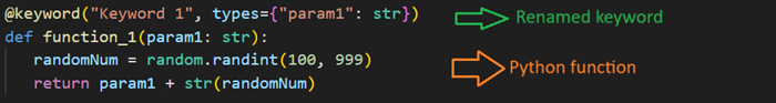 After that, place the @keyword decoratoron top of the Python function and define the name of the keyword you want.