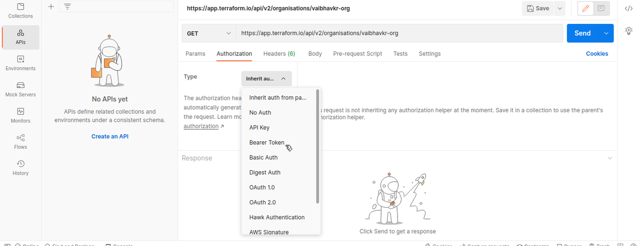 In following Image, I used POSTMAN to run do a get request on “https://app.terraform.io/api/v2/oraganizations/<organisation-name>/”.
