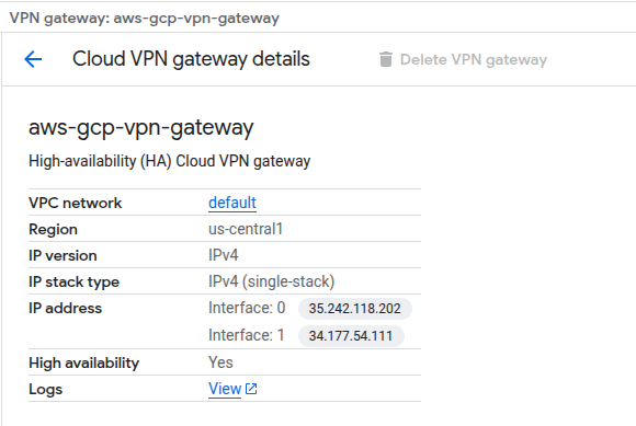 aws-gcp-vpn-gateway). - Link it to the default network and set the region.