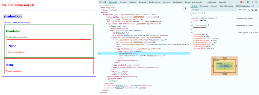 As seen in the earlier example, the <h2> elements of ShadowDomEncapsulationComponent and NoEncapsulationComponent are styled differently. The header in Shadow DOM appears red, while in Angular’s example it shows up blue.