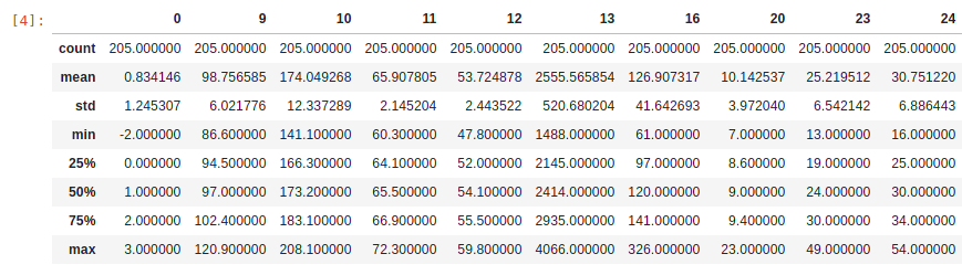 If we would like to get a statistical summary of each column e.g. count, column mean value, column standard deviation, etc., we use the describe method