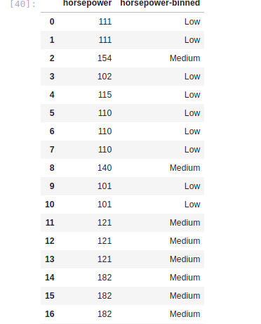 In our dataset, “horsepower” is a real valued variable ranging from 48 to 288 and it has 59 unique values. What if we only care about the price difference between cars with high horsepower, medium horsepower, and little horsepower (3 types)? Can we rearrange them into three ‘bins’ to simplify analysis?
