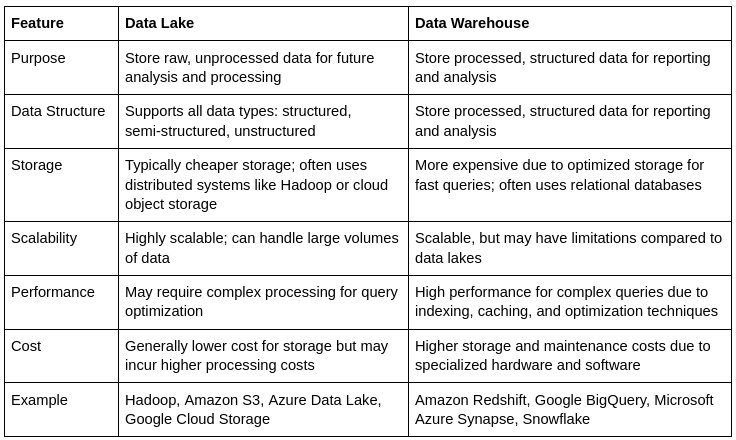 Summarized differences between Data Lake and Data Warehouse: