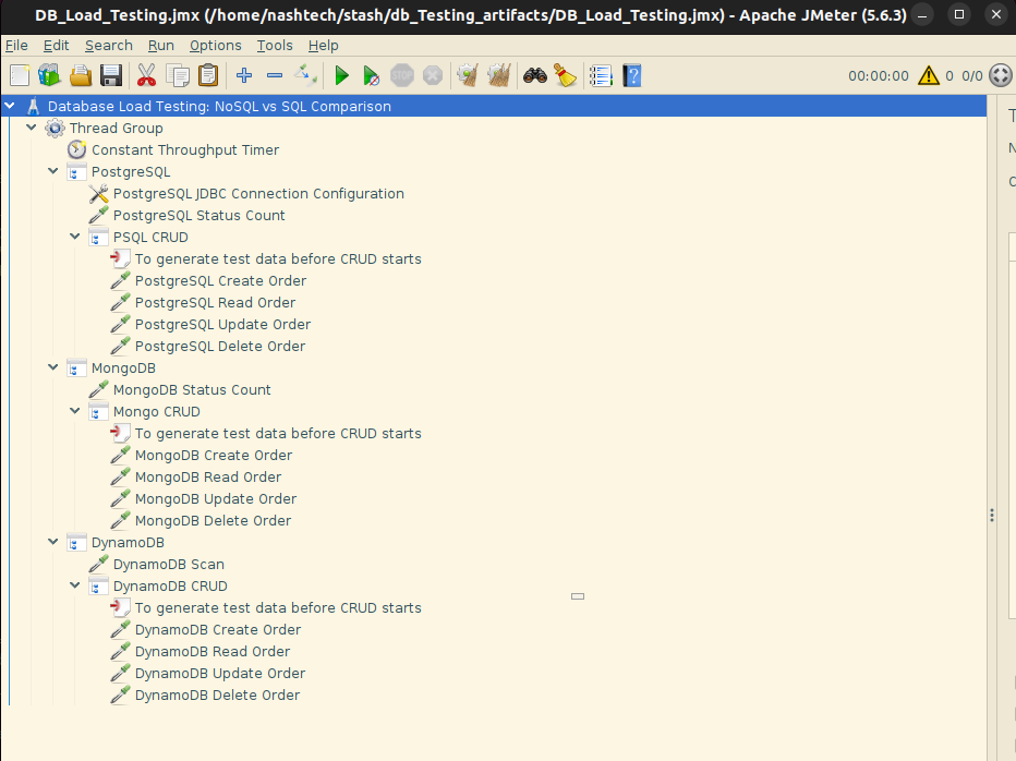 The JMeter script targets PostgreSQL (SQL), MongoDB, and DynamoDB (NoSQL). It uses three Transaction Controllers, each handling a specific database. These controllers encapsulate the operations relevant to their respective data stores, ensuring modularity and separation of concerns.