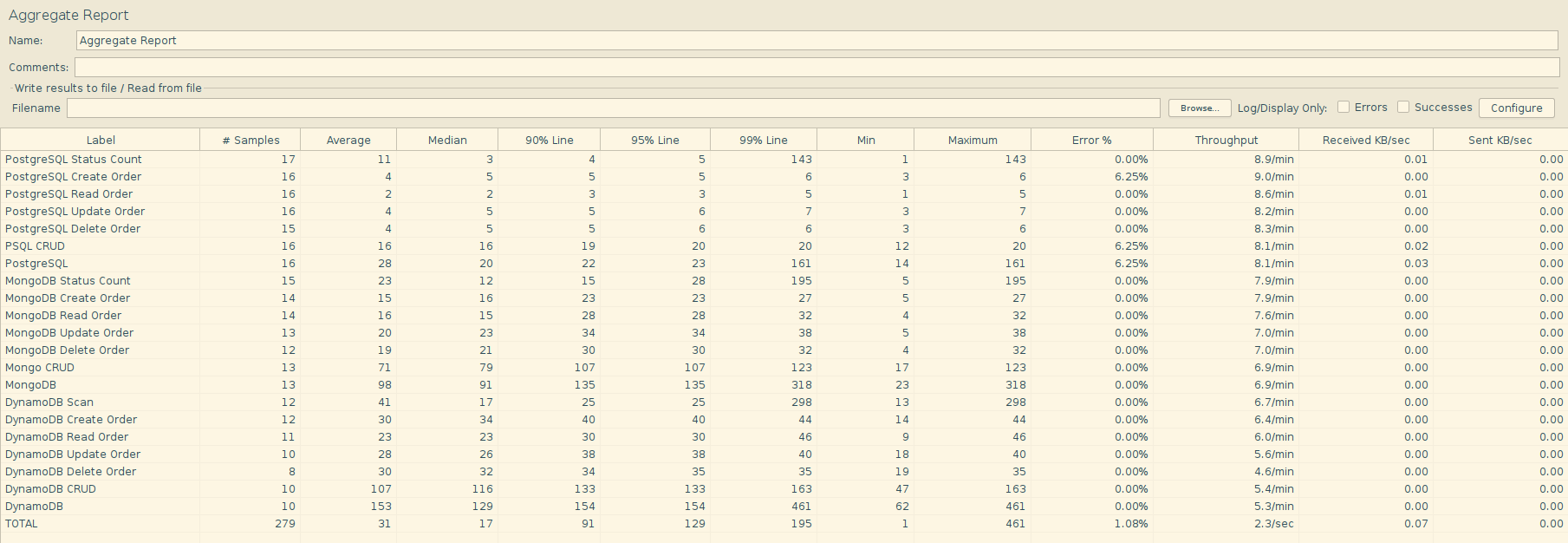- MongoDB showed consistent behavior with slight increase in response time, yet stable throughput.