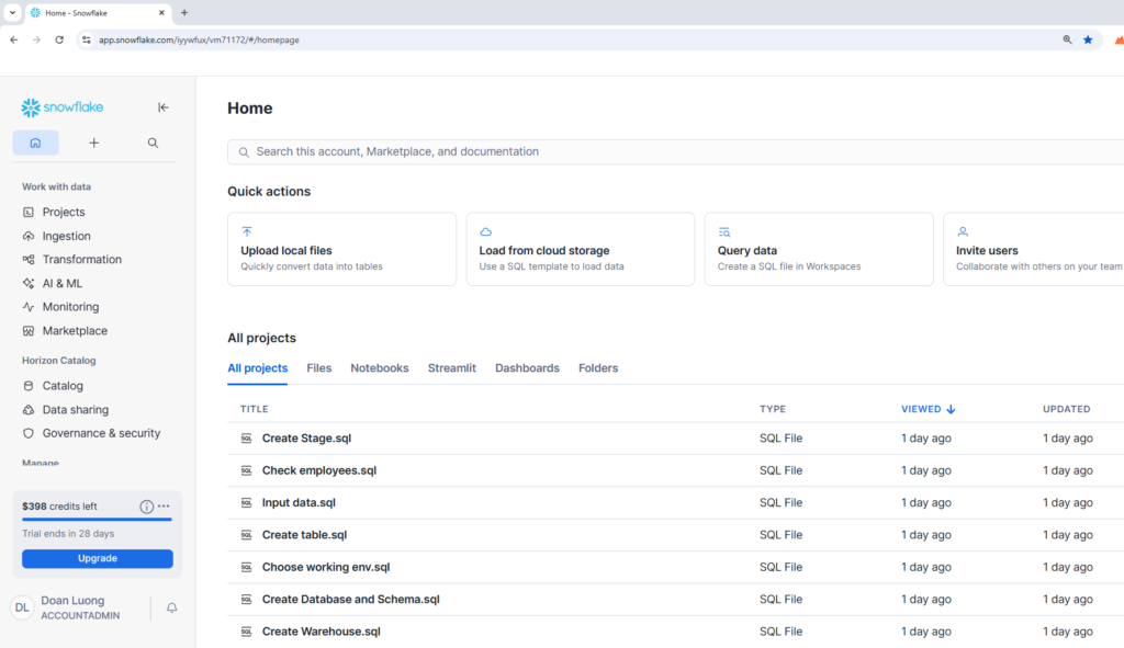 We now have access to the Snowflake web interface, where we can write SQL queries and manage our database.