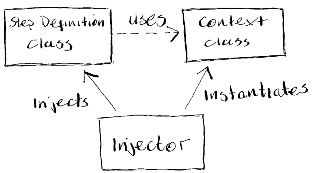 The challenge to the above problems is how do we create the first AND ONLY instance of a context class and then share it between all our step definition classes. We need a clever way to hand off the creation and management of Context class to another entity. That entity is our Context Injector that is responsible for creating the instance of the ‘Context’ class and ‘injecting’ the Context class into any other classes that might need it. It is also recreated every time a new scenario is executed. Each scenario has a fresh world and leakage between scenarios through this object is unlikely.