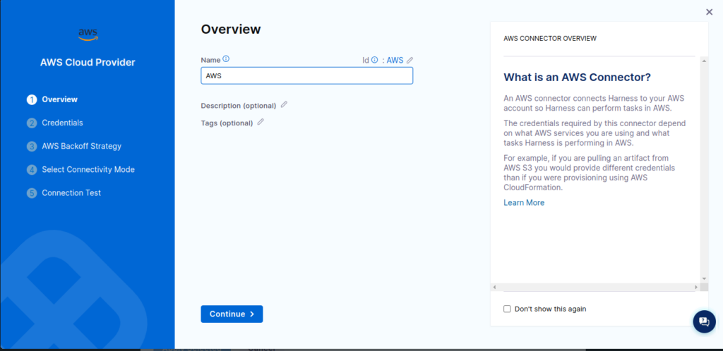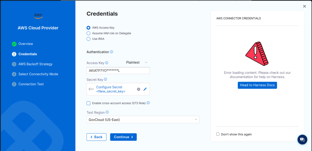 For AWS Backoff strategy select Fixed Delay and on the connectivity mode select Connect through Harness platform for now and click continue.