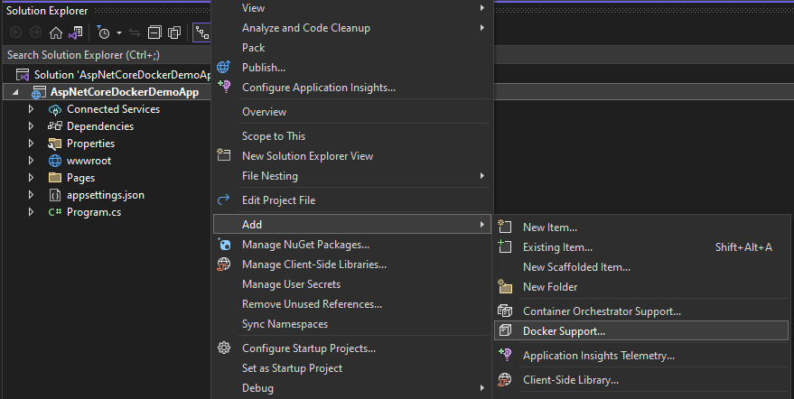 If you have an existing ASP.NET Core application and you want to add Docker support you can follow the steps below: