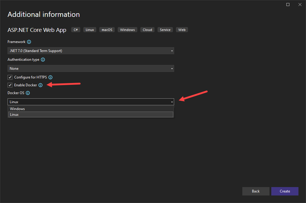 • In the Additional information dialog, you need to check the Enable Docker support checkbox. This will enable the Docker OS dropdown from where you can select Windows and then click on the Create button.