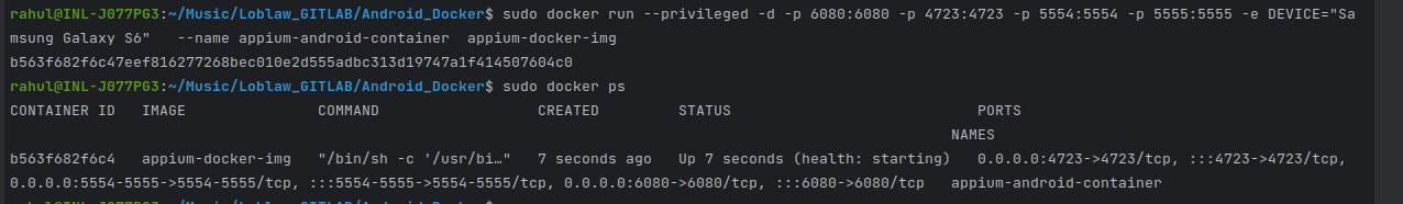 docker run --privileged -d -p 6080:6080 -p 4723:4723 -p 5554:5554 -p 5555:5555 -e DEVICE="Samsung Galaxy S6" --name <containerName> <dockerImageName>