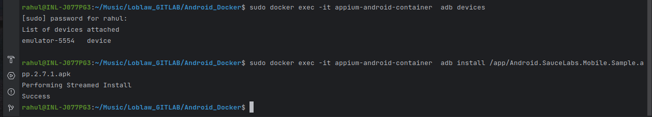 - Copy test Suits and Mobile App: Ensure that the test code and app file are accessible inside the Docker container, either by copying it into the container during the build process or by mounting it as a volume when running the container.