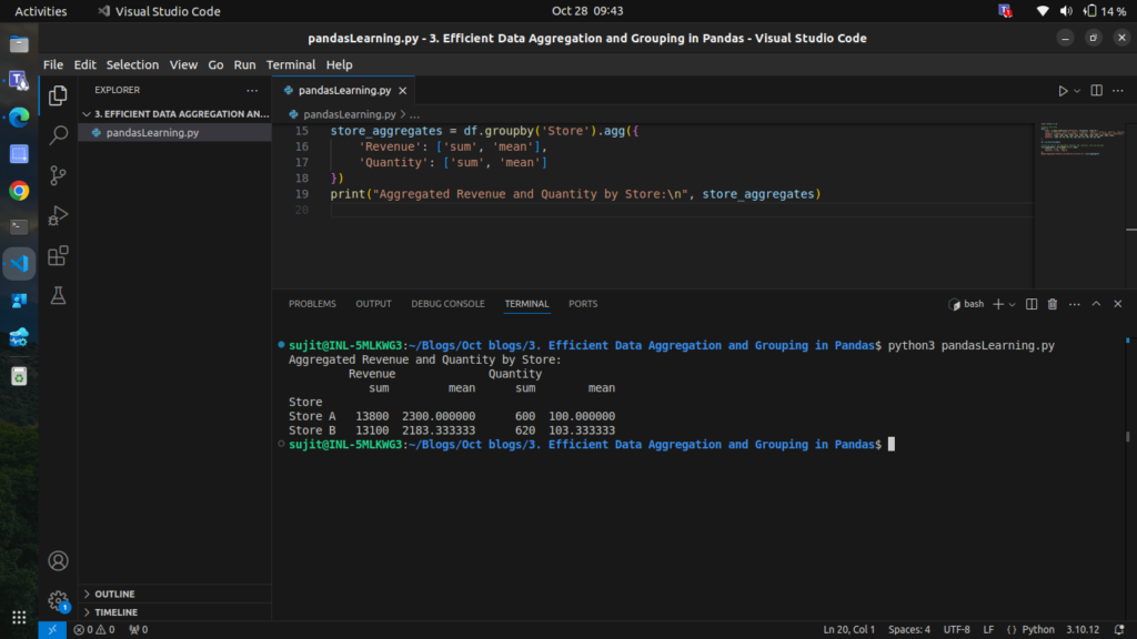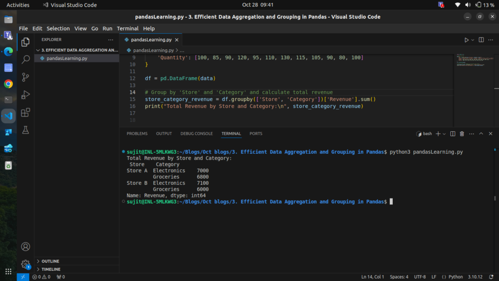 The groupby function splits your DataFrame into groups based on some criteria. Let’s start with grouping by Store and calculating the total Revenue for each store.