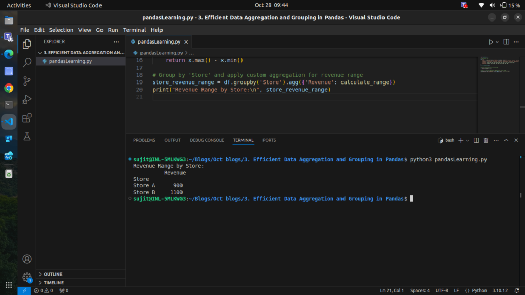 You can apply custom functions within agg to perform specialized calculations. Let’s use a custom function to calculate the range (max – min) for Revenue