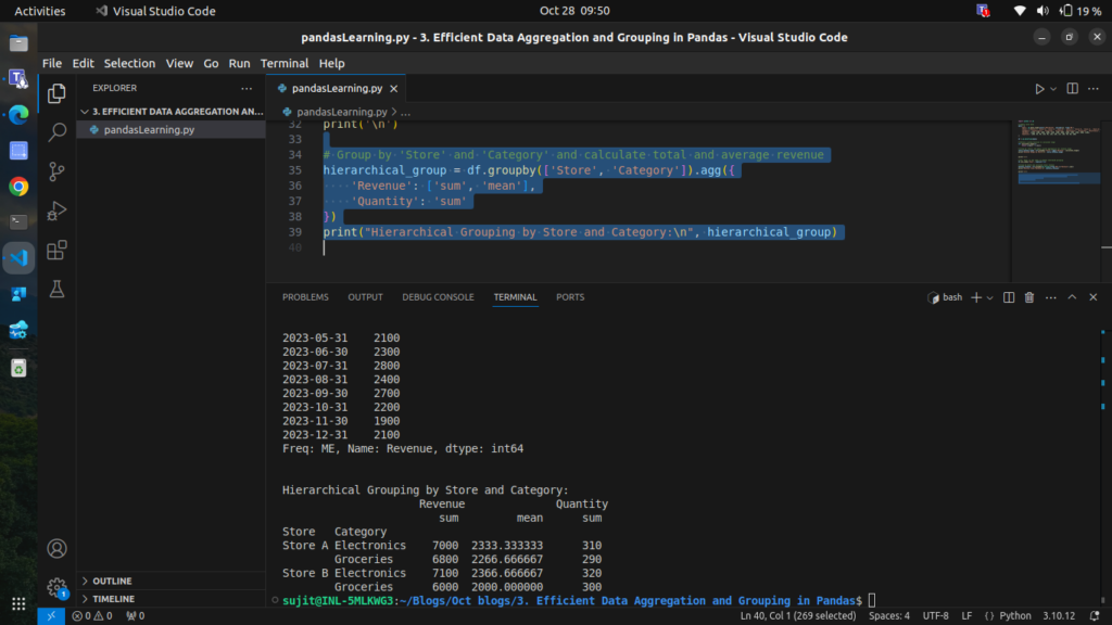 When grouping by multiple columns, Pandas returns a DataFrame with a multi-level index, also known as a hierarchical index. Let’s explore how to handle this by grouping Store and Category, then performing aggregation.