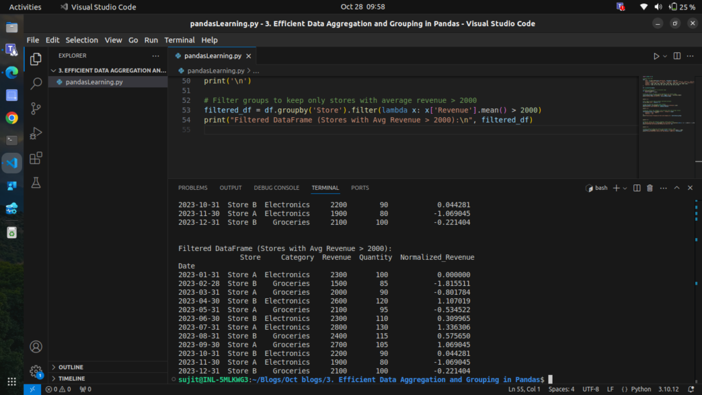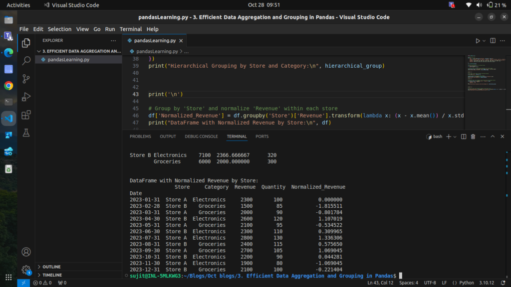transform allows you to apply a function to each group independently and return a result that aligns with the original DataFrame. For instance, let’s normalize Revenue within each store.