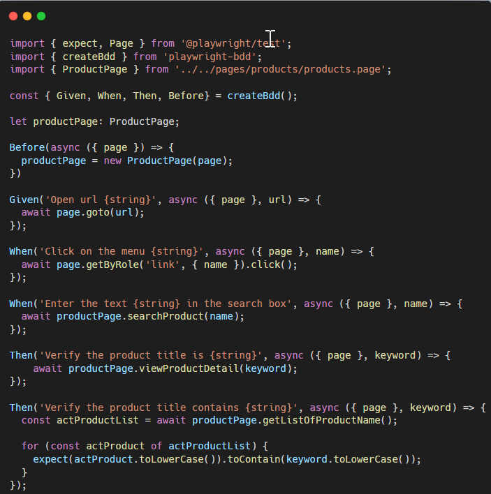 With the scenarios finalized, you can link them to your existing step definitions. By reusing steps, you can prevent the test codebase from growing exponentially. playwright-bdd makes this easy by allowing you to write reusable, modular step definitions.