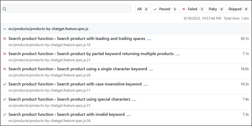 Step 4: You can save that .feature file and run tests with the command npx bddgen && npx playwright test. Here is final test result