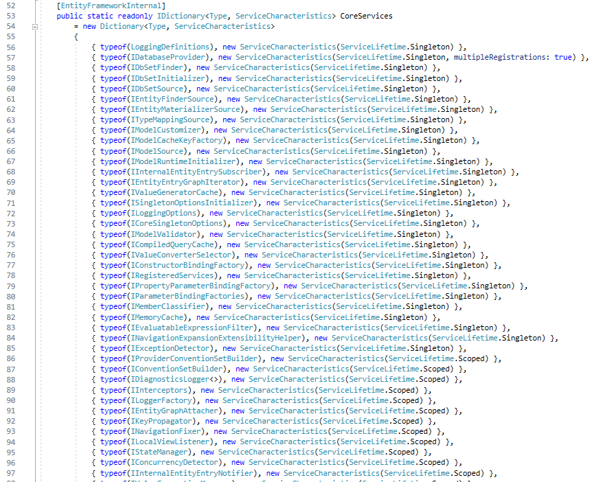 Core Services are common or default services used by EF Core, but they can be replaced easily, Let’s take a look at the EntityFrameworkServicesBuilder class to see how services are stored and registered.