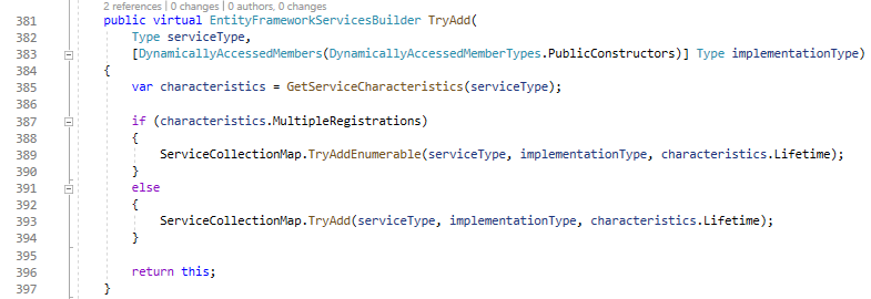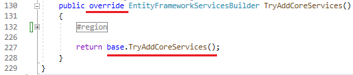 Now, let’s go back to the EntityFrameworkServicesBuilder class again and check where the TryAddCoreServices() method gets called.