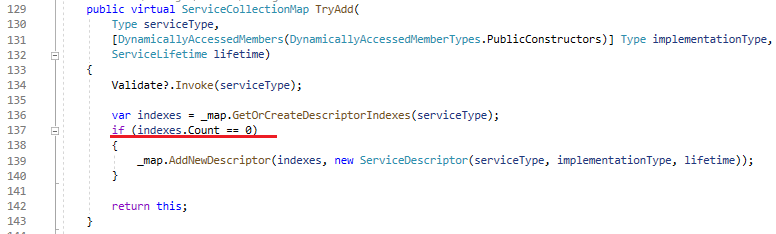 Let’s take a look to see how the method TryAdd is implemented in the ServiceCollectionMap class.
