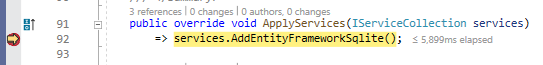 In our BloggingContext we are using throughout the demo of the series, the AddEntityFrameworkSqlite will be called and all the services will be registered: