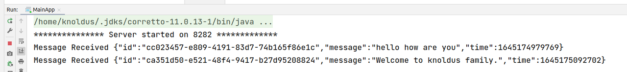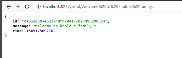 When you access the URL http://localhost:8282/send/:message, here message is the parameter that you are sending to verticle and getting the message body in reply. for example if we make a request on http://localhost:8282/send/Welcome to knoldus family. then the response will be like below pic: