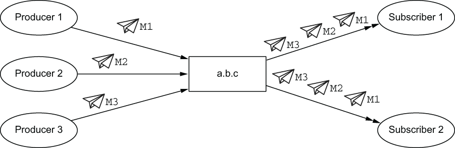 Messages M1M2, and M3 are each sent by a different producer, and all subscribers receive the messages, unlike in the case of point-to-point messaging. It is not possible to specify reply handlers for publish/subscribe communications on the event bus.