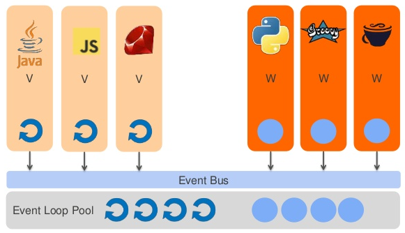 Since Vert.x is polyglot, the event bus allows verticles written in different languages to communicate with each other without requiring any complex language interoperability layer, whether for communications inside the same JVM process or across the network.