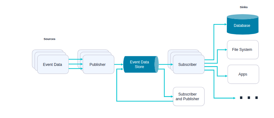Event-driven data flow — publishers emit events to an event store (like Kafka), which subscribers consume asynchronously to update databases, apps, or other systems.