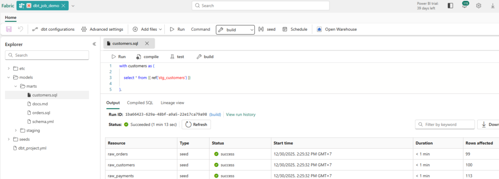 Fabric highlights “visual insights into runs, tests, and lineage.” In daily work, this is one of the most useful parts: you can validate what dbt produced and how models depend on each other without leaving Fabric.