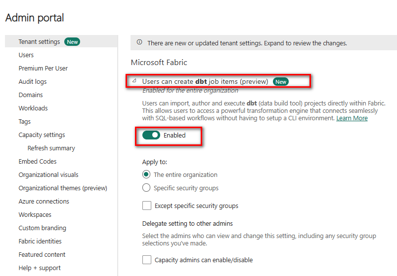 Tenant admin must enable dbt jobs (preview) in Fabric Admin portal