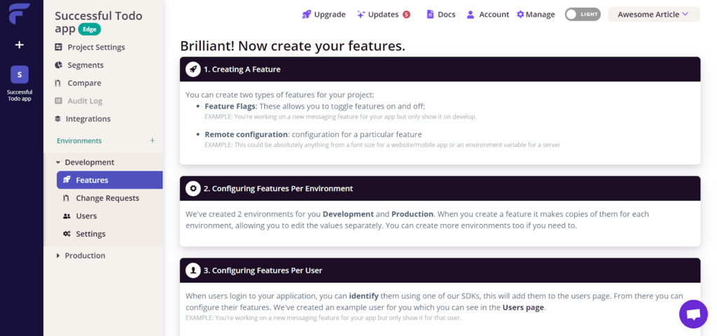 - Centralized management: Manage flags across multiple environments and platforms from one dashboard.