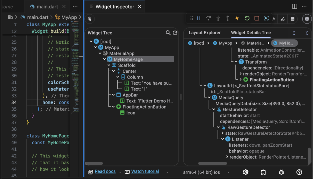 – Widget Inspector inside IDE(VSCode, Android Studio), allowing you to explore the widget tree, debug layout issues.