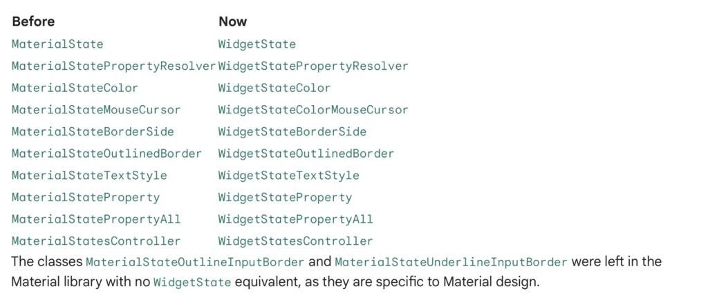 Previously, MaterialState provided logic for handling multiple different states a widget could have, like “hovered”, “focused”, and “disabled”. Because this functionality is useful outside the Material library, namely for the base Widgets layer and Cupertino, it was decided to move it outside of Material. As part of the move, and to avoid future confusion, the different MaterialState classes have been renamed to WidgetState. The behavior of the two are the same.