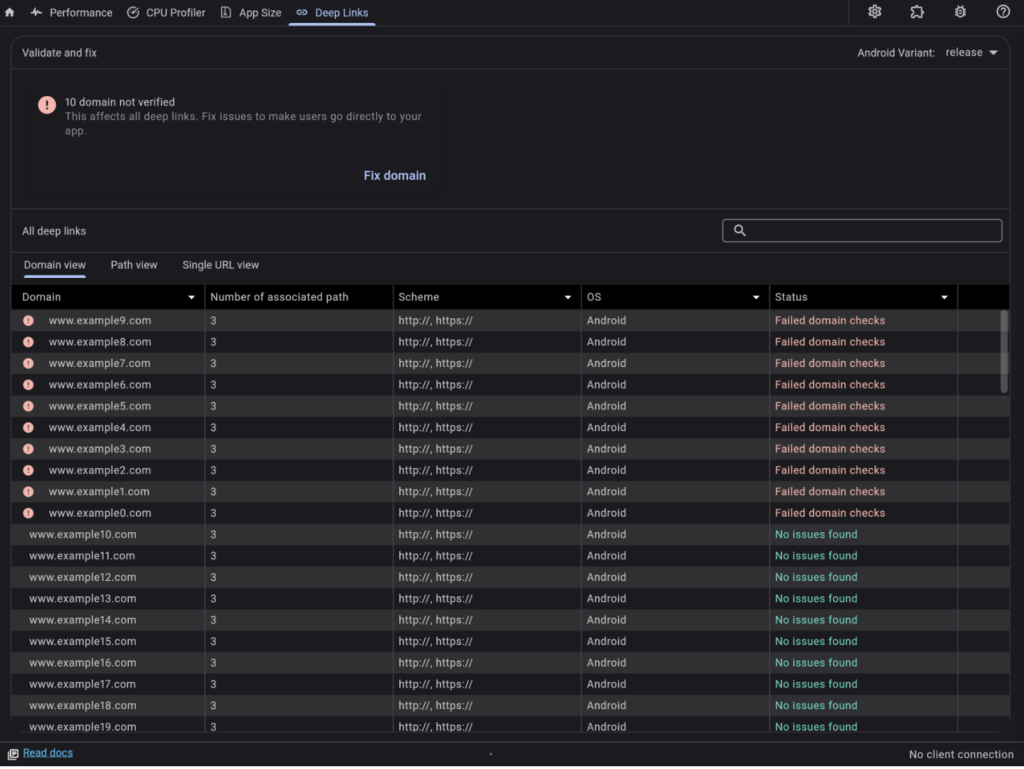 – DevTools validate deeplinks setup on Android.