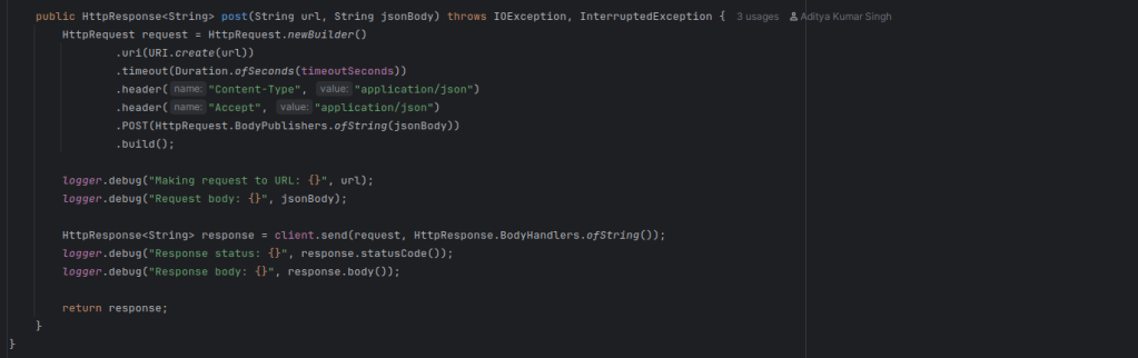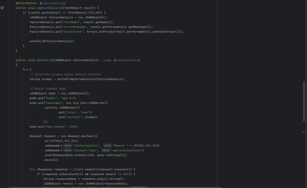 To find out when a test fails, use TestNG’s @AfterMethod hook in your base test class (such as BaseTest.java). When it does, create a JSONObject with all of the information mentioned above and send it on to the following step for logging or LLM analysis. The foundation of your integration is failure capture in JSON, which is how you transform unprocessed automation output into insightful, comprehensible data.