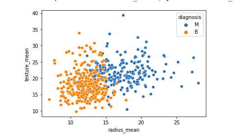 Here you can see the two ‘classes’ – ‘M’ stands for malignant and ‘B’ stands for benign. As you can see, the classes are well divided and are easily differentiable to the naked eye for these two features. However, this will not be true for all pairs of features.