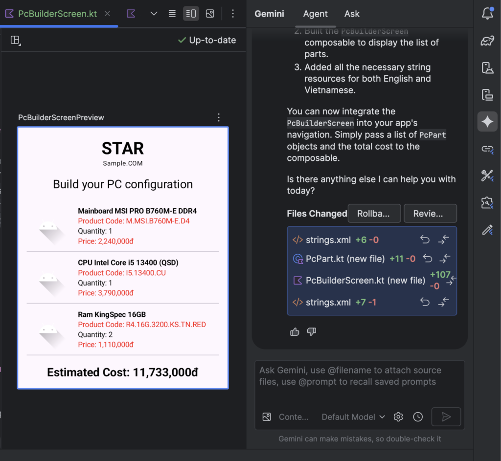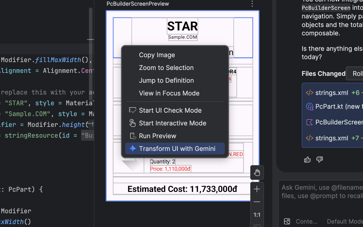 Because the assistant understands your existing themes, styles, color resources, and project structure, the UI it generates naturally fits into the rest of your codebase. This dramatically speeds up the design-to-code workflow, making it easier for both designers and developers to explore ideas, iterate quickly, and bring polished interfaces to life much faster.